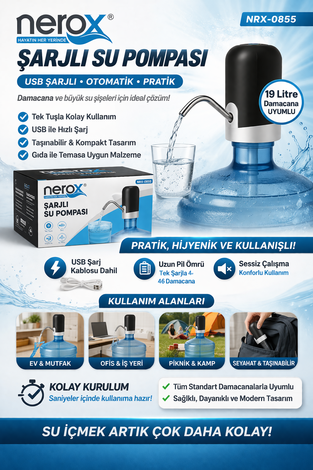 şarjlı su pompası, damacana su pompası, nerox su pompası, usb su pompası, otomatik su pompası, damacana aparatı, elektrikli su pompası, su sebili pompası, taşınabilir su pompası, nrx0855, damacana su makinesi, su pompası fiyatları, pratik su pompası, ev tipi su pompası, şarjlı damacana pompası
